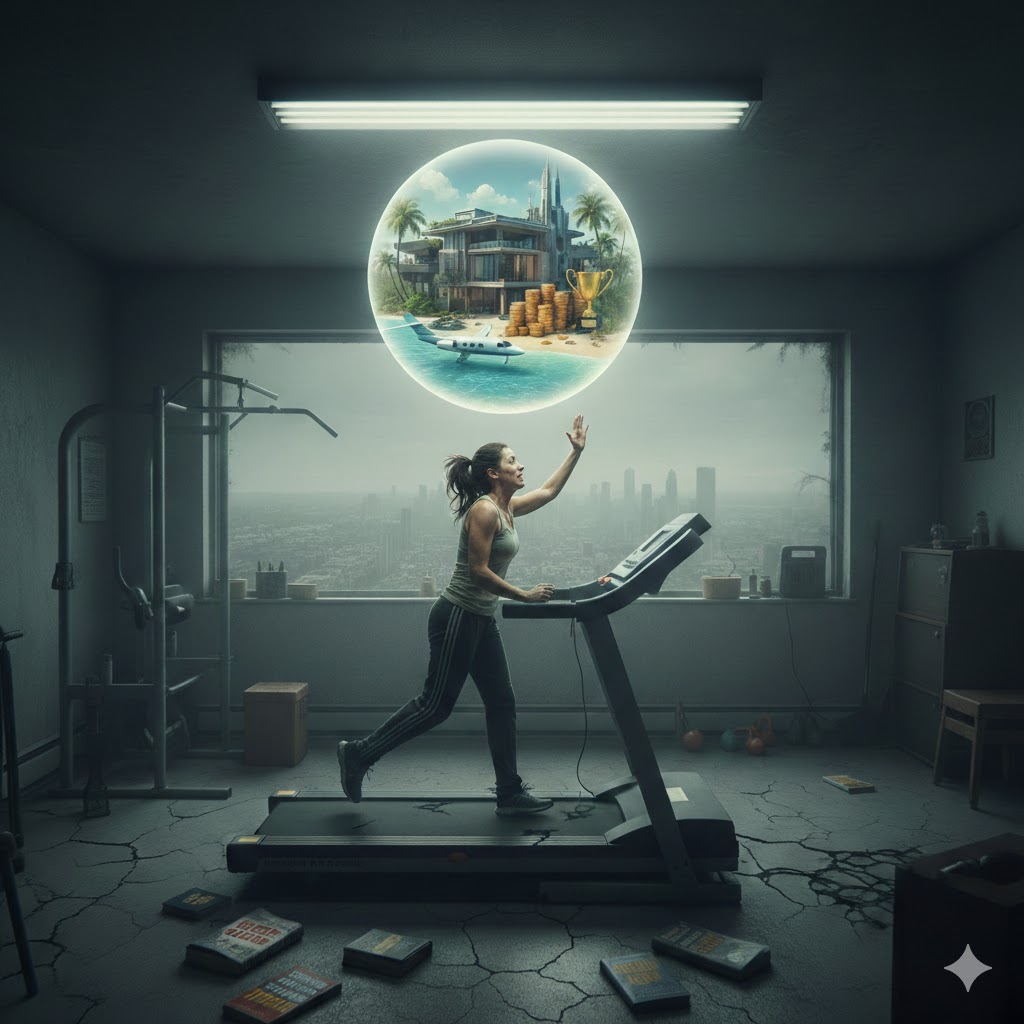 woman on treadmill chasing vision of wealth